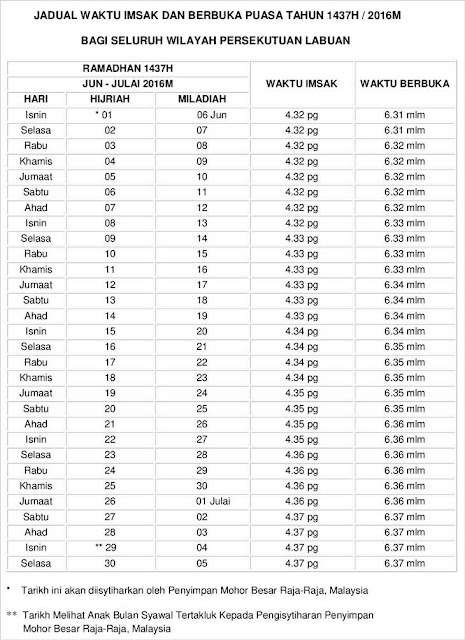 JADUAL WAKTU BUKA PUASA DAN IMSAK 2016 / 1437H UNTUK SELURUH WILAYAH PERSEKUTUAN PUTRAJAYA DAN LABUAN
